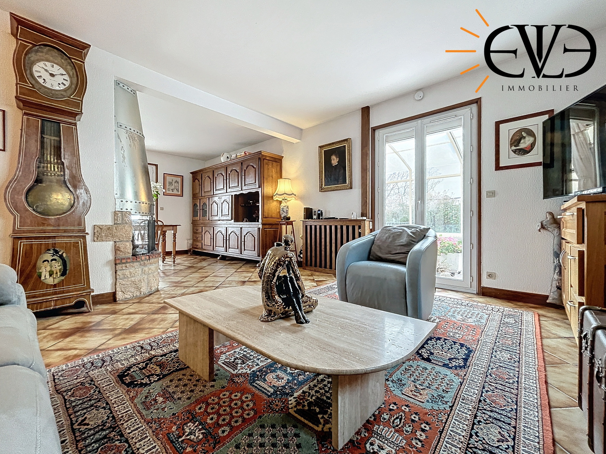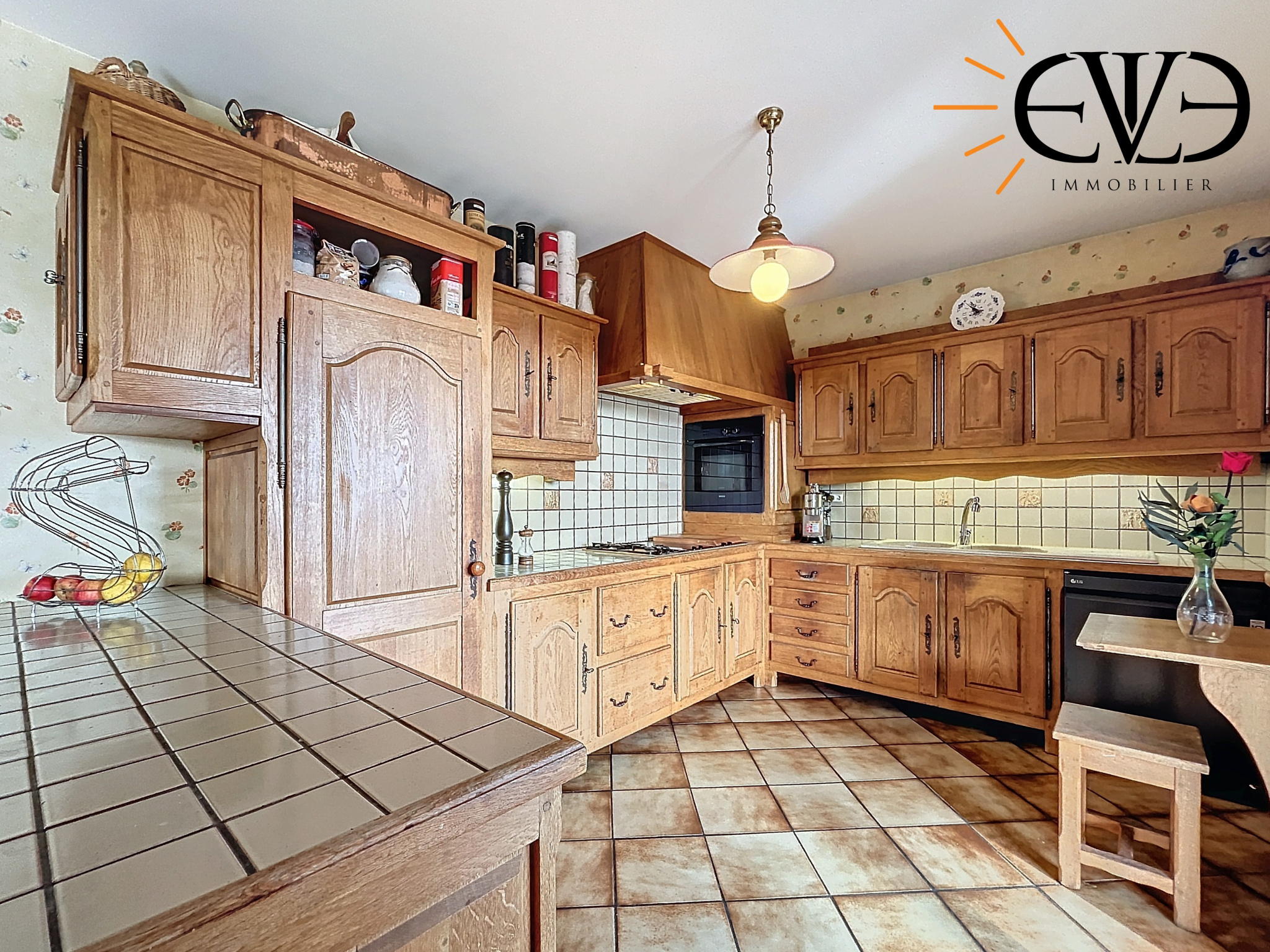 – Grande pièce à vivre ouverte sur une cuisine équipée.